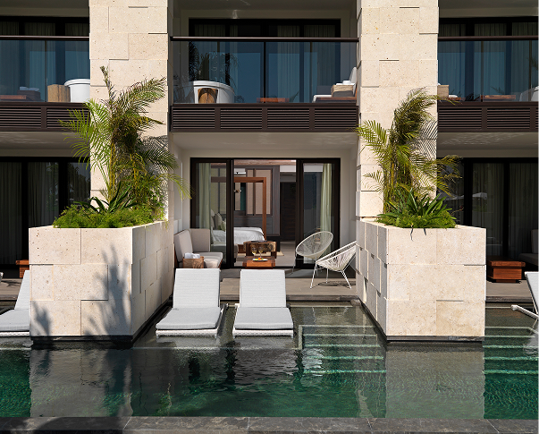 Experience the perfect fusion of indoor elegance and outdoor freedom in the Alcoba Swim-Up Pool room. This highly sought-after suite grants you direct access to the refreshing pool from your private, spacious terrace, allowing you to immerse yourself in the water the moment you step outside.